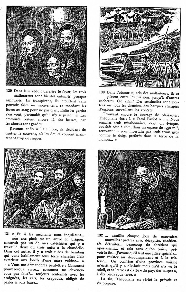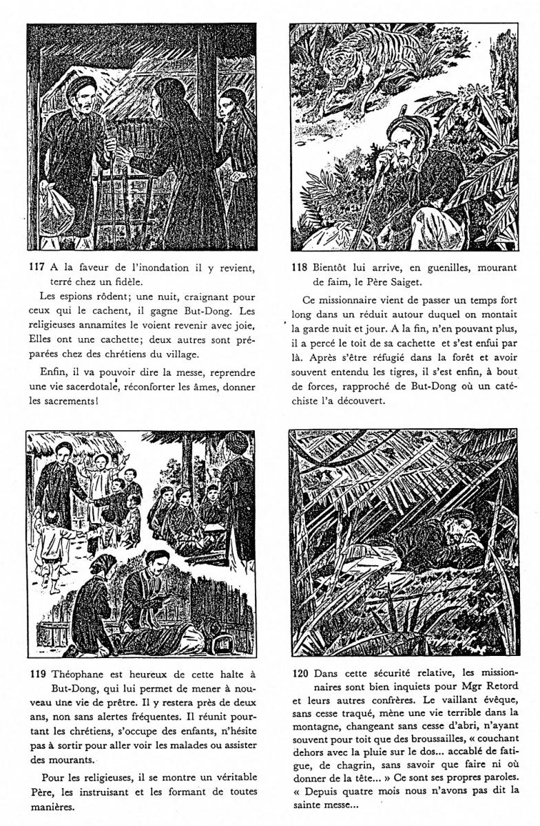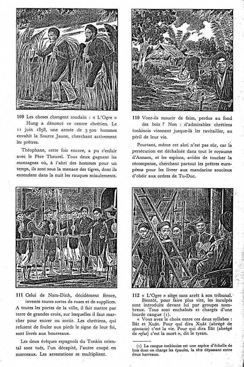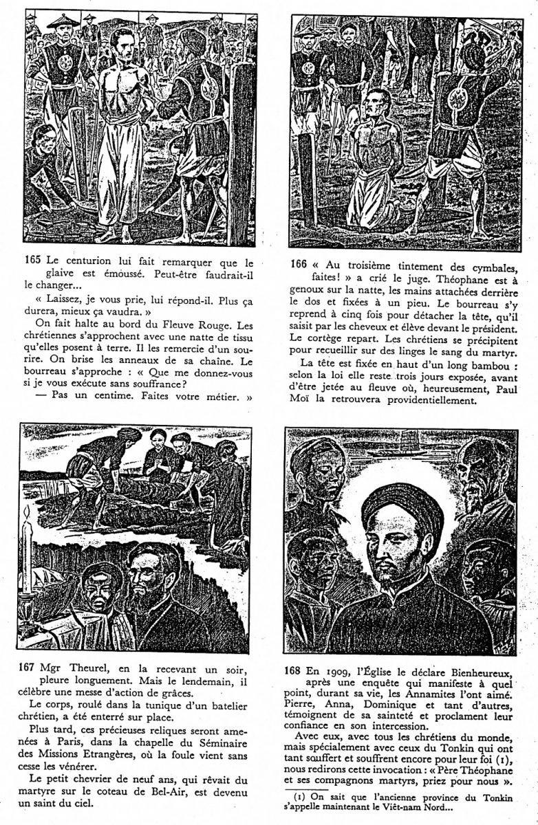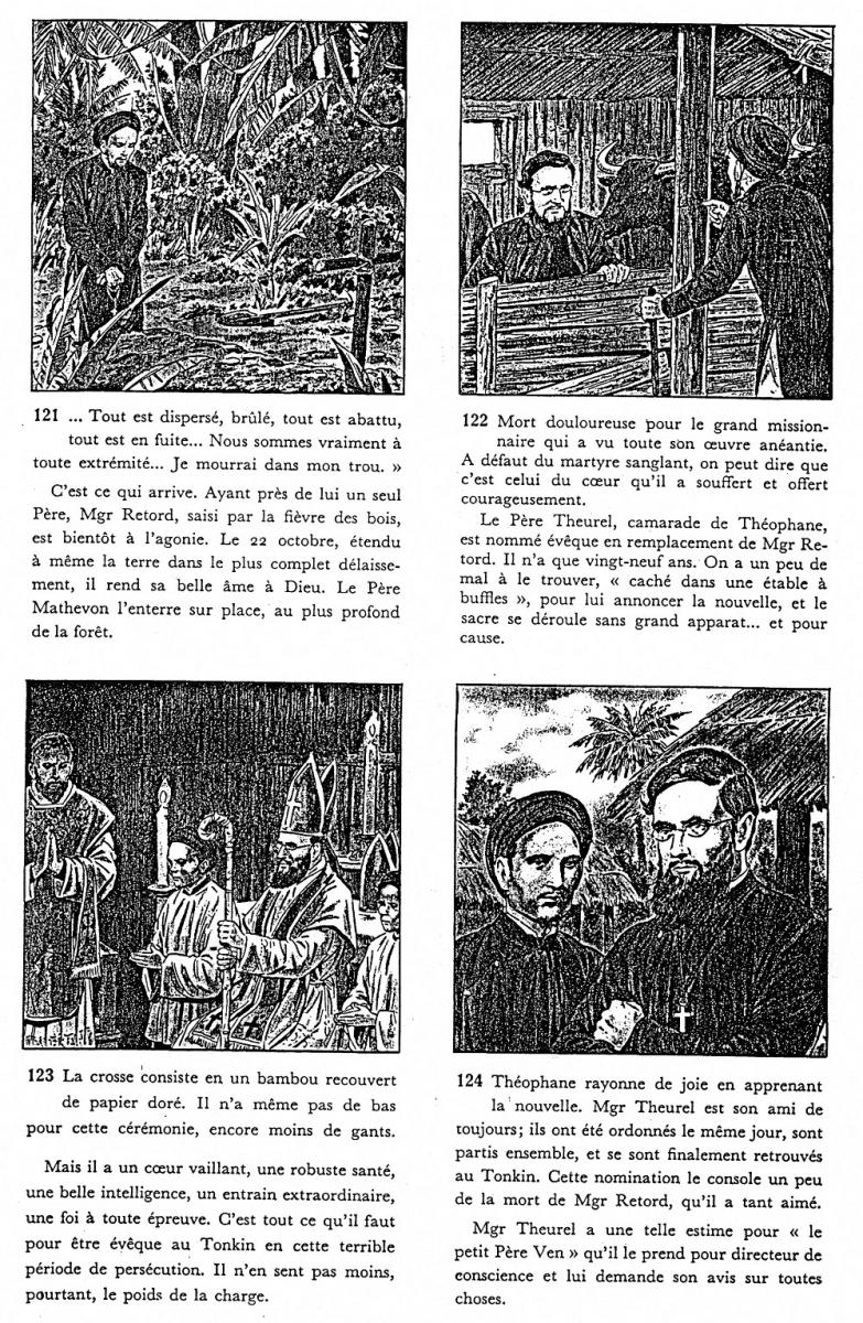 Joseph THEUREL a eu pour ami aux Missions Étrangères Théophane VÉNARD qu'il retrouve au Tonkin, au pire des persécutions. Dans les documents suivants (vignettes à ouvrir l'une après l'autre) on a un aperçu sous forme d'extraits de "bande dessinée", d'un épisode dramatique de leur histoire commune, celui de la traque des missionnaires obligés de se cacher dans les montagnes et la jungle dans des conditions de survie abominables - l'évêque du Tonkin, Monseigneur Retord n'y survit pas et Joseph Theurel apprend dans sa cachette qu'il est appelé à le remplacer (extrait 3) - et l'exécution de Théophane Vénard, dans des conditions particulièrement féroces (extrait 5) . Celui-ci a été béatifié par la suite. Un article assez documenté sur ce personnage est accessible sur wikipédia.