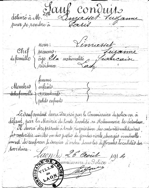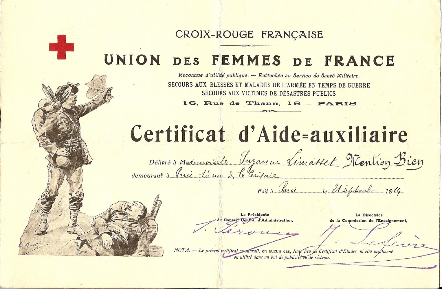 Comme tous les autres, Maurice est sur le front en octobre 1914. Et tout est devenu compliqué, entre autre pour se déplacer librement. Suzanne obtient dès la fin du mois d'août un sauf-conduit (ouvrir ce lien pour voir) lui permettant de circuler entre Laon, où sa mère et une partie de sa famille a préféré rester rue Saint-Cyr, et Paris, où son père occupe l'appartement de la rue de la Cerisaie où il s'efforcera d'ailleurs rapidement de rapatrier les siens, très exposés à Laon. C'est d'ailleurs l'adresse parisienne des Limasset qui figure sur le Certificat d'Aide Auxiliaire obtenu avec Mention"bien" par Suzanne en septembre 1914, afin de contribuer à l'aide aux blessés qui déjà reviennent du front.