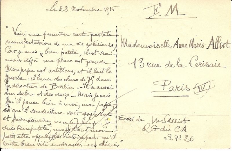 De Paris où les familles ALLIOT et ROL doivent être réunies le soir du 31 décembre 1912, son oncle Eliacin ROL lui écrit (lettre datée du 31 décembre 1912) que l’on pensera bien à lui dont la place à table restera vide (c’est la première fois qu’il n’est pas au foyer familial à cette date..), mais qu’il est à Laon dans des conditions heureuses, et il ajoute :