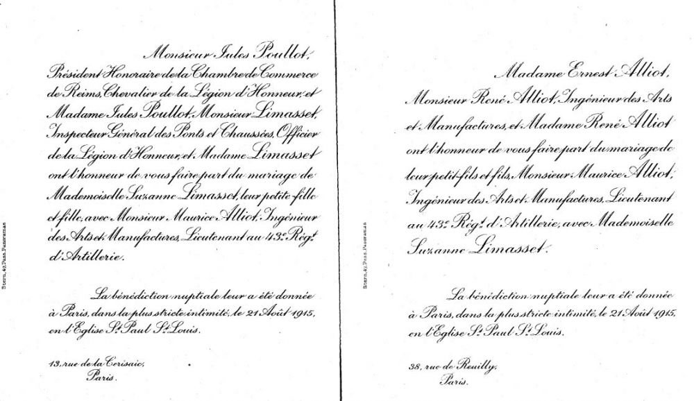 Suzanne avait 17 ans et beaucoup de charme, elle jouait du violon dans l’orchestre familial, et Maurice avait presque 21 ans…Aussitôt sorti de l’Ecole, en 1912, Maurice fait son service militaire à Laon. Il est alors souvent reçu rue Saint-Cyr dans la famille Limasset, par exemple à la veille de la nouvelle année 1913.