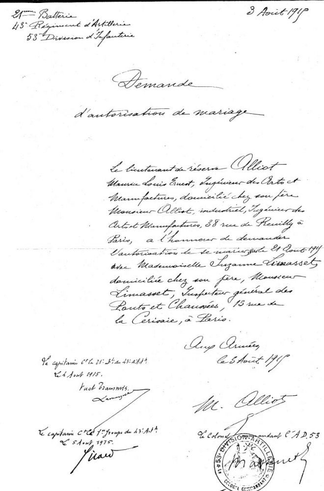 Le mariage, donc, n'aura lieu que le 21 août 1915, en pleine guerre. Maurice doit d’ailleurs obtenir pour ce faire l’autorisation des autorités militaires (lettre de demande ci-dessous à droite): On reconnaît d'ailleurs sur la lettre de demande de Maurice, le nom des supérieurs directs de Maurice, les capitaines de Lamarzelle et Girard, que l'on trouve souvent évoqués dans les pages consacrées à la guerre proprement dite.