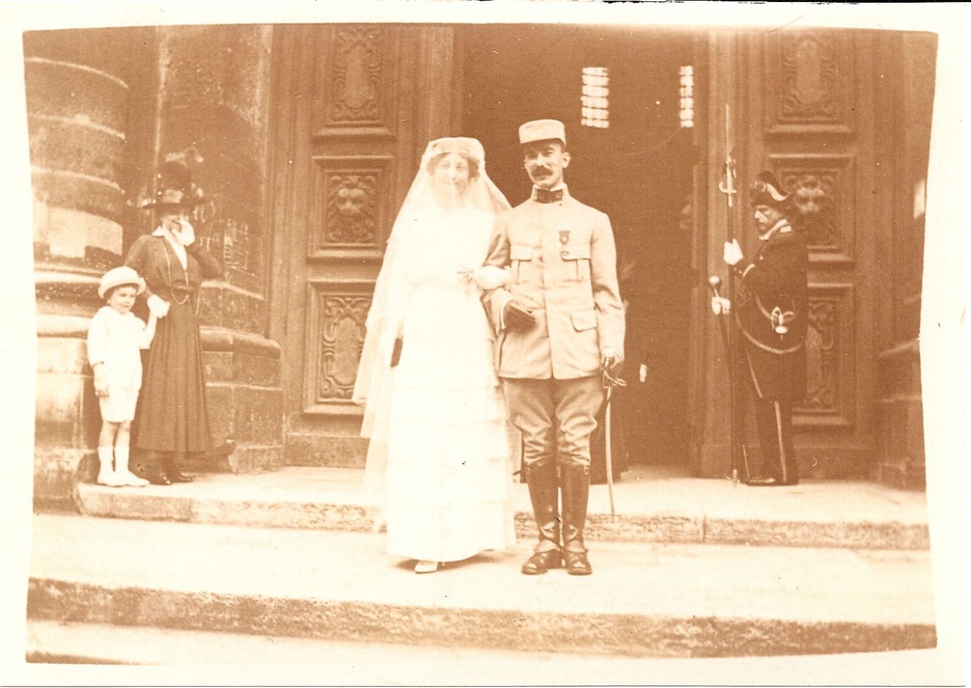 C’est finalement dans l’intimité qu’est célébrée la cérémonie, beaucoup d’hommes sont au front et pour les familles, il est difficile de se déplacer. Maurice, d’ailleurs, doit rejoindre rapidement son régiment. Les faire-part (cliquer pour voir le document) informent d'une cérémonie qui a eu lieu dans la plus stricte intimité, le 21 août 1915.... On est loin de l'apparat projeté par Marie avant la déclaration de guerre ! Au sortir de la messe de mariage, Maurice et Suzanne, sous l'oeil amusé de Renée Limasset qui tient la main de son neveu Jacques Klein, sourient aux marchandes des 4 saisons sur la place. On raconte que celles-ci, femmes ou même parfois veuves de soldats, auraient commencé à huer et à traiter le marié de «planqué», puis, voyant l’uniforme, elles auraient applaudi ! Sur cet autre cliché, Maurice et Suzanne sont au seuil de l'une des adresses familiales, sans doute chez les Limasset, rue de la Cerisaie, où Suzanne occupera quelques temps après, non loin de celui de ses parents, un petit appartement avant de s'installer plus tard avec Maurice boulevard Henri IV.