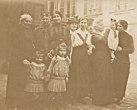 De gauche à droite sur cette photo, prise dans la cour de l'usine de Reuilly, on voit "Bonne-maman" (Héloïse Alliot), Marie Alliot, Suzanne, enceinte, Eva Neville, Thérèse, René, derrière, Madame Brisset, grande amie de la famille d'Ernest et Héloïse Alliot: Elle tient dans ses bras Françoise, 3ème fille de Marcelle (à droite). Ses filles aînées, Madeleine (future épouse Demars) et Andrée (future épouse Brunet) posent aussi pour la photo.