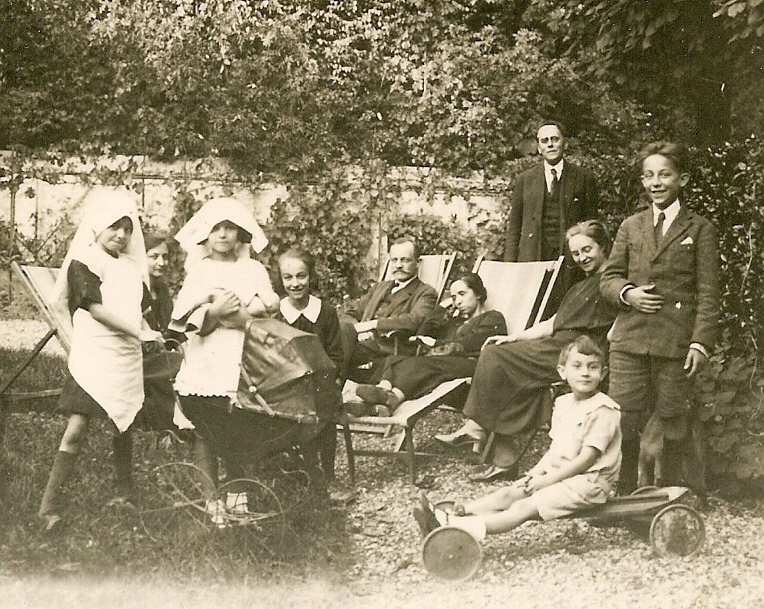 Sur la photo qui suit, Annie est habillée en nurse et tient son poupon (à moins qu'elle ne soit déguisée en "Madame Donato ?". Elle est entourée de ses cousines Elisabeth, qui tient la poussette, et Simone, assise, les filles d'André Limasset (il est assis dans un transat) et de Jeanne (allongée à ses côtés). Leur fils aîné, Pierre, est à droite de la photo. Debout derrière le groupe, c'est l'oncle Louis ROL. Il a épousé en 1921 Elisabeth Allain, à droite, qui, amusée, regarde Henri, assis sur sa voiture à pédales (*). On aperçoit Suzanne, assise derrière les petites filles.