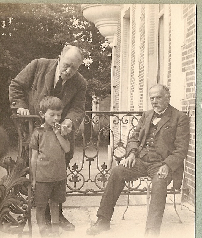 Le perron ouvre le "billard" sur la partie du jardin qui domine les bords de la Loire. C'est un endroit agréable pour s'asseoir après le déjeuner et prendre quelques clichés de ces moments heureux. On reconnaît Maurice, Suzanne, Eliacin et Juliette Rol, Annie et Henri, encadrant leur grand-mère, et "tante Thérèse" à l'arrière. René, "grand-père" prend la photo. C'est au tour de Maurice de fixer cette image du grand-père René Alliot initiant son petit fils aux privilèges des grandes personnes, sous l'oeil mi-amusé mi-inquiet de son beau-frère !