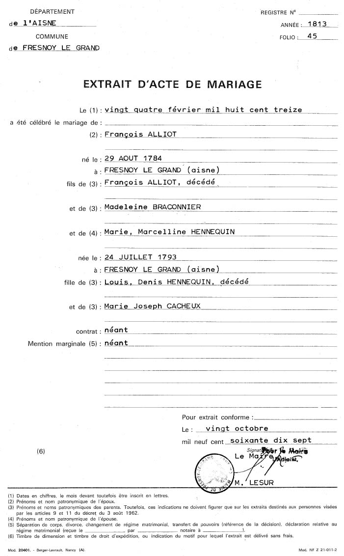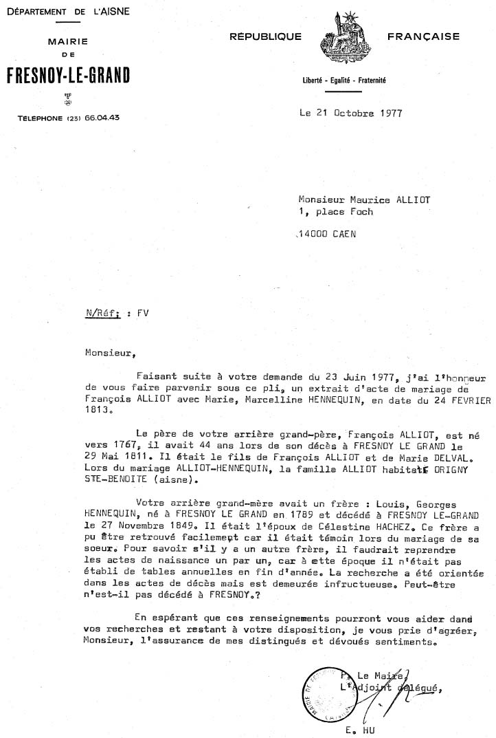 François ALLIOT né le 29 août 1784 à FRESNOYE-LE-GRAND († le 30 septembre 1866) qui épouse en 1813 Marie Marcelline Hennequin (ces prénoms sont inscrits à l’état civil lors de son mariage, mais on l'a appelée aussi Séraphine), née le 24 juillet 1793 à FRESNOYE-LE-GRAND († le 3 avril 1869). Ce sont les parents d'Ernest ALLIOT, qui fut lui-même le père de René ALLIOT et le grand-père paternel de MAURICE ALLIOT