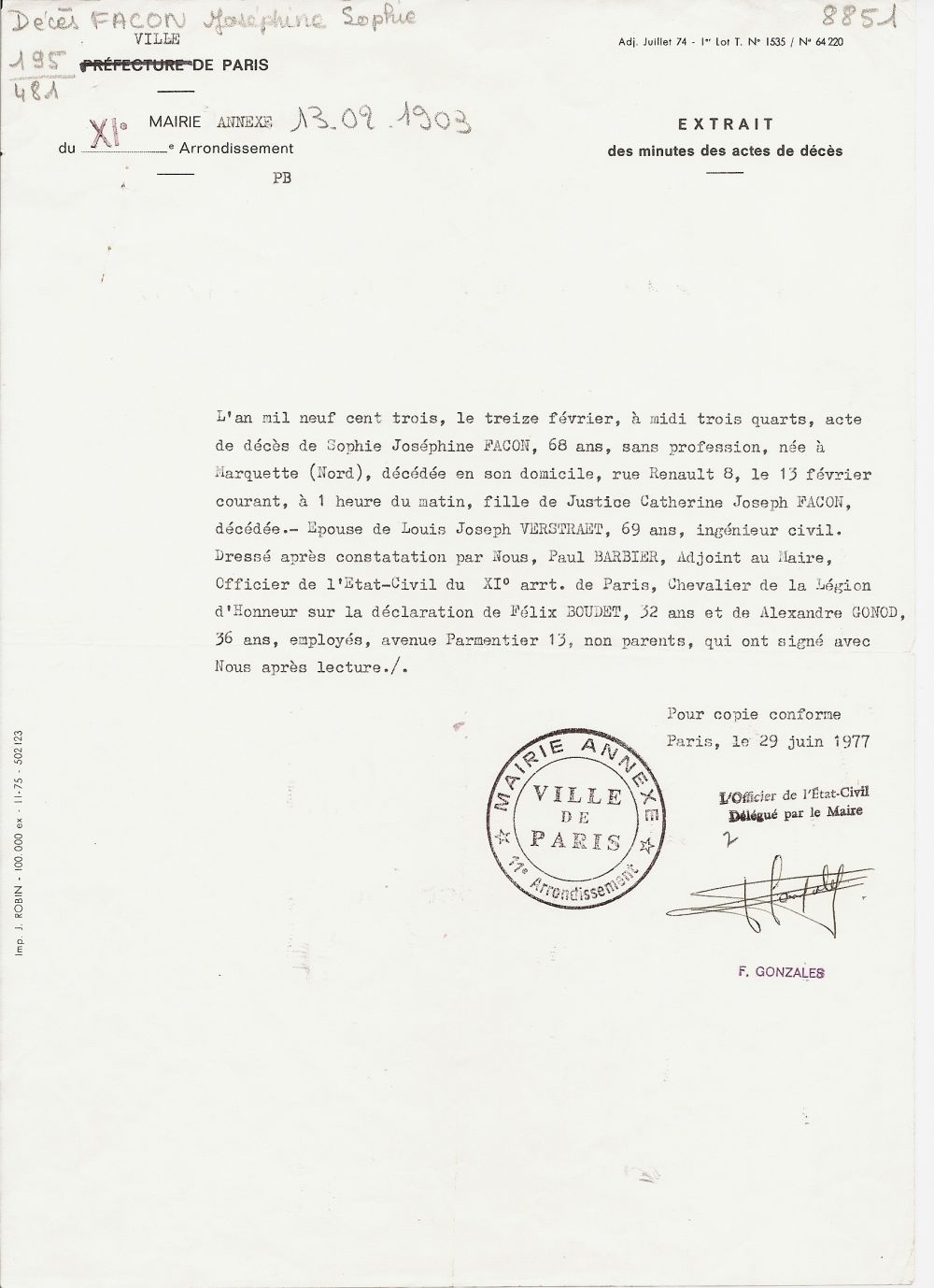 De Sophie VERTRAET, née FACON, il ne reste pas de souvenirs: Seul un portrait, celui d'une femme fortement charpentée, mais dont on ne sait rien: Quelle femme fut-elle, épouse d'un homme épris de science, fréquentant les milieux les plus éclairés de cette industrie sûre d'elle-même et de son succès? Quelle mère fut-elle pour Malvina, Marie? Maurice lui-même s'est interrogé. En 1977, il fait dresser par la mairie du XIe copie de l'acte de décès (cliquer pour lire) de sa grand-mère: A ce document, il a joint dans ses archive l'un de ses petits papiers sur lesquels il notait questions ou réponses sur ses ancêtres. Et là, à propos de Sophie Verstraët, il note: "côté FACON, je ne connais pas de parents... Y aurait-il eu des Lejeune, des Desmazières? Ils figurent sur le faire-part de décès..."