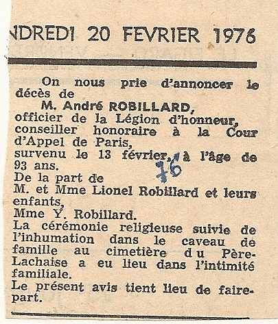 Suzanne Robillard était loin de supposer que 16 jours seulement plus tard, c'est elle qui partirait.... le froid de Paris a-t-il eu raison d'elle? on est en juin, pourtant, le 19. André, son mari, reste. Il disparaît 9 ans plus tard, le 1" février 1976, à 93 ans.