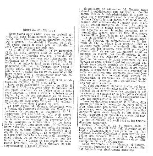 L'article suivant, paru à Rouen lors du décès de Félix MENGUS, donne une idée de son rôle et de son implication dans cette ville de ROUEN dont il est devenu un notable: