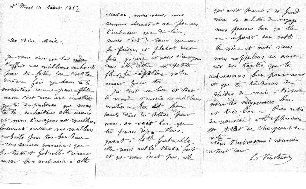 Le 14 août 1887, de saint-Denis, Louis écrit à sa fille: Elle est en visite dans la famille d'Houplines. Le lendemain, c'est sa fête: la dernière que son père lui souhaite avant qu'elle ne soit Madame Alliot! Et puis il demande à sa fille d'user de toute sa conviction pour faire venir à la noces les tantes d'Houplines! Il parle aussi de Gabrielle (elle a 9 ans alors) qui devrait bien écrire comme promis à ses grand-parents! Pour lire cette lettre, cliquer ici.