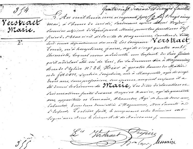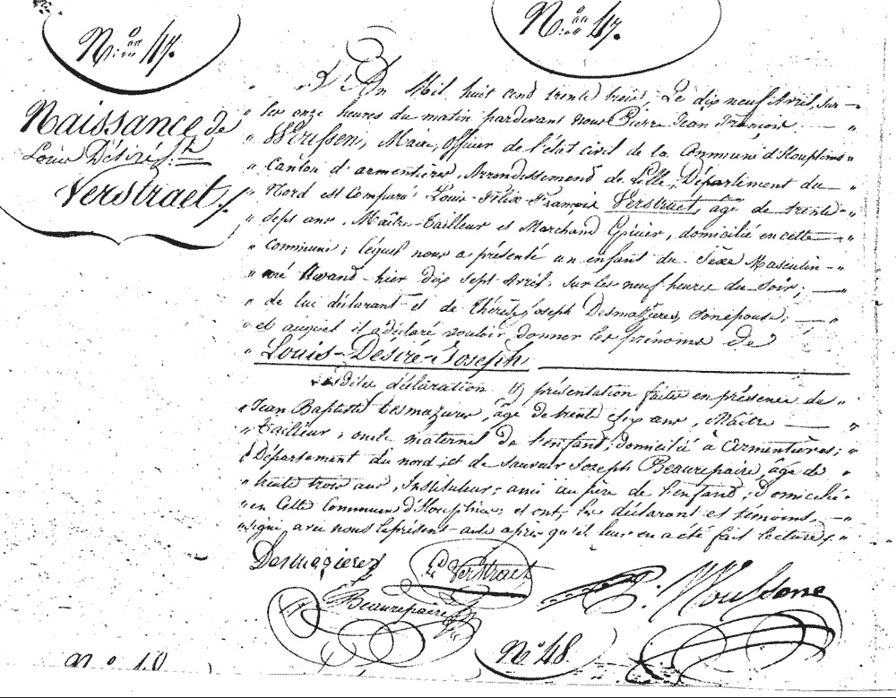 "Le 17 avril 1833 est né à Houplines, canton d’Armentières, arrondissement de Lille, département du Nord, Louis Désiré Joseph VERSTRAET, fils de Louis Félix François, âgé de 37 ans, Maître Tailleur et Marchand Epicier, et de Thérèse Joseph DESMAZIERES, son épouse." La déclaration s’est faite devant l’officier d’état civil de Houplines en présence de Jean-Baptiste Desmazières, Maître Tailleur à Armentières, frère de Thérèse, et de Sauveur Joseph Beaurepaire, instituteur à Houplines, ami de Louis Félix. (voir le document original)