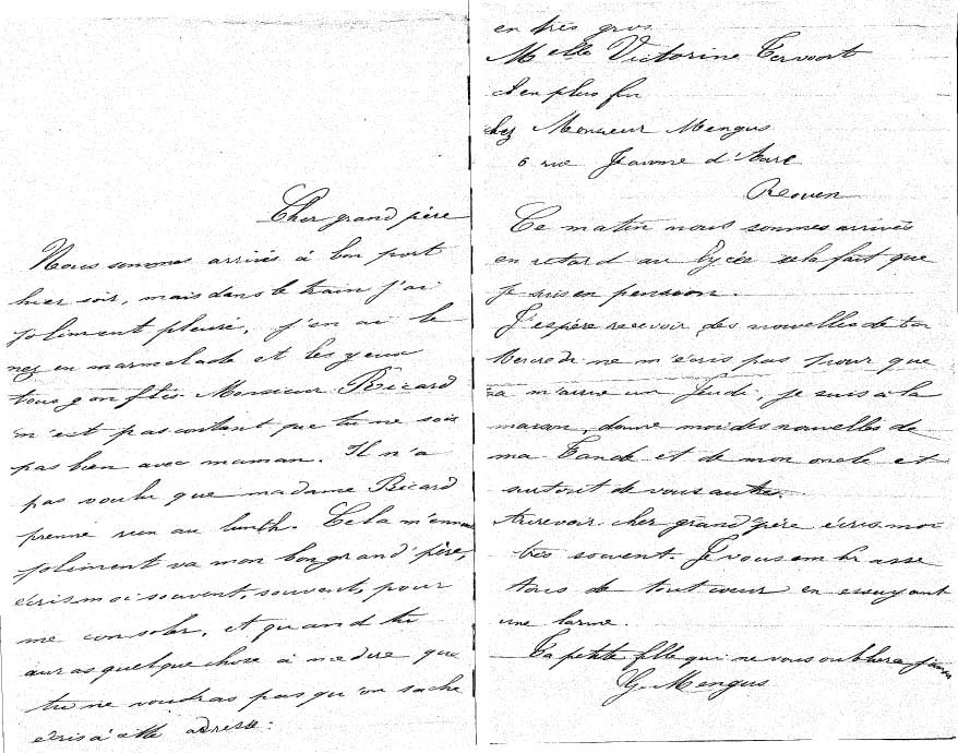 « Nous sommes arrivés à bon port hier soir, mais dans le train j’ai joliment pleuré, j’en ai le nez en marmelade et les yeux tout gonflés. Monsieur Ricard n’est pas content que tu ne sois pas bien avec maman. Il n’a pas voulu que Madame Ricard prenne rien au lunch (peu lisible). Cela m’ennuie joliment va, mon bon grand-père, écris moi souvent, souvent pour me consoler et quand tu auras quelque chose à me dire que tu ne voudras pas qu’on sache, écris à cette adresse: en très gros : Mlle Victorine Tervoort, et en plus fin : Chez M. Mengus, 6 rue Jeanne d’Arc, Rouen. Ce matin, nous sommes arrivés en retard au lycée. Cela fait que je suis en pension. J’espère recevoir des nouvelles de toi mercredi. Ne m’écris pas pour que je reçoive ça un jeudi, je suis à la maison. Donne moi des nouvelles de ma tante et de mon oncle, mais surtout de vous autres. Au revoir cher grand-père. Ecris moi très souvent. Je vous embrasse tous de tout cœur en essuyant une larme.