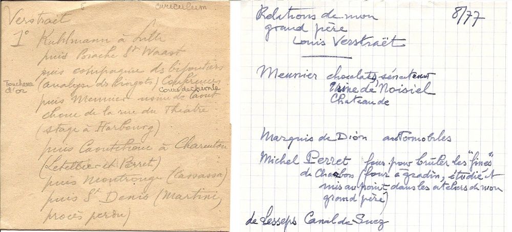 L'histoire de la famille VERSTRAET, avant et après les mariages de Malvina, puis de Marie, est liée à l'itinéraire professionnel du père de famille, Louis. Aussi, bien que les chapitres suivants lui soient consacrés, on peut déjà ici en donner une idée. La difficulté est que, aussi passionnant que soit cet itinéraire, il n'est évoqué que dans de brèves annotations de la main de Maurice ALLIOT, son petit-fils: liste des relations de son grand-père, liste de lieux, ou évocations éparses de souvenirs de jeunesse auprès de ses grands parents VERSTRAET. Et encore ces notes sont-elles écrites par Maurice âgé, comme s'il était temps de se souvenir de cet aïeul au profil si singulier. Pourtant, ces quelques notes, documents ou photos, suffisent à imaginer (avec des compléments trouvés sur internet) une carrière étonnante, où Louis a côtoyé de véritables pionniers de l'industrie et des personnalités du monde scientifique, économique et politique de l'époque. Cet itinéraire n'est pas très facile à retracer dans un ordre chronologique, les notes, donc, étant succinctes.