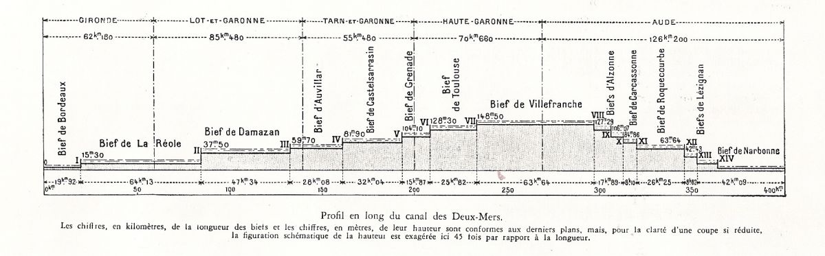 Les dimensions qu'il assignait au canal des Deux-Mers étaient les suivantes: 70 mètres de largeur au plan d'eau et 40 mètres au plafond par 10 mètres de profondeur. Tous les 12 kilomètres, un garage devait faciliter l'évolution des navires. Les écluses étaient dotées d'ascenseurs qui, en dix minutes, pouvaient élever sans perte d'eau des navires de 5.000 à 6.000 tonnes d'un bief à un autre, soit 100 navires par vingt-quatre heures. Grâce à la puissance et au perfectionnement de ces engins, le nombre des écluses avait été réduit au strict minimum; il n'en restait que treize et, parmi les quatorze biefs de mer à mer, celui d'Agen se développait sur 150 kilomètres de long, allant des écluses de la Leyre à celles de Layrac.
