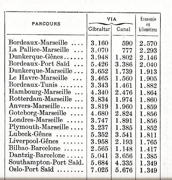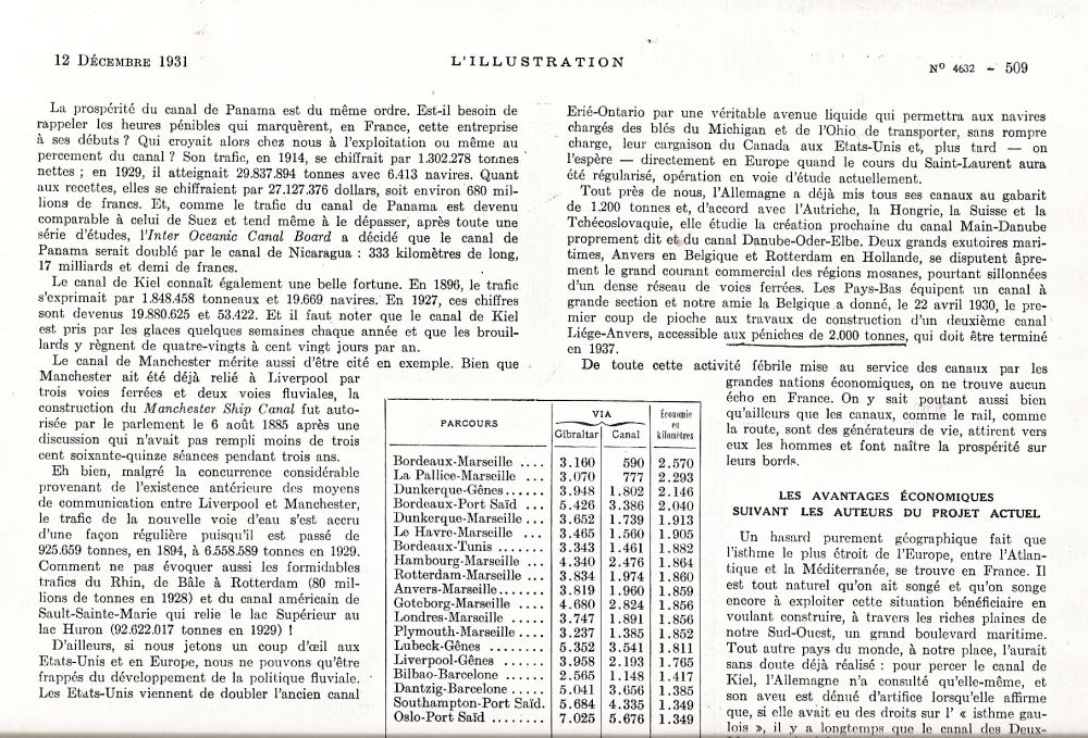L'essentiel de son exposé, en effet, réside dans les répercussions économiques qu'aurait le canal des Deux-Mers au triple point de vue méridional, national et international. Au point de vue transit international d'abord, il représenterait la route abrégée de la Méditerranée vers le Nord, prolongement naturel du canal de Suez ou inversement. Il permettrait de réduire le coût des assurances maritimes et de diminuer la dépense de combustible. Le temps ainsi gagné se chiffrerait par plusieurs jours ainsi qu'on peut le voir pour les parcours-exemples cités. (Voir le tableau de la page 509.)