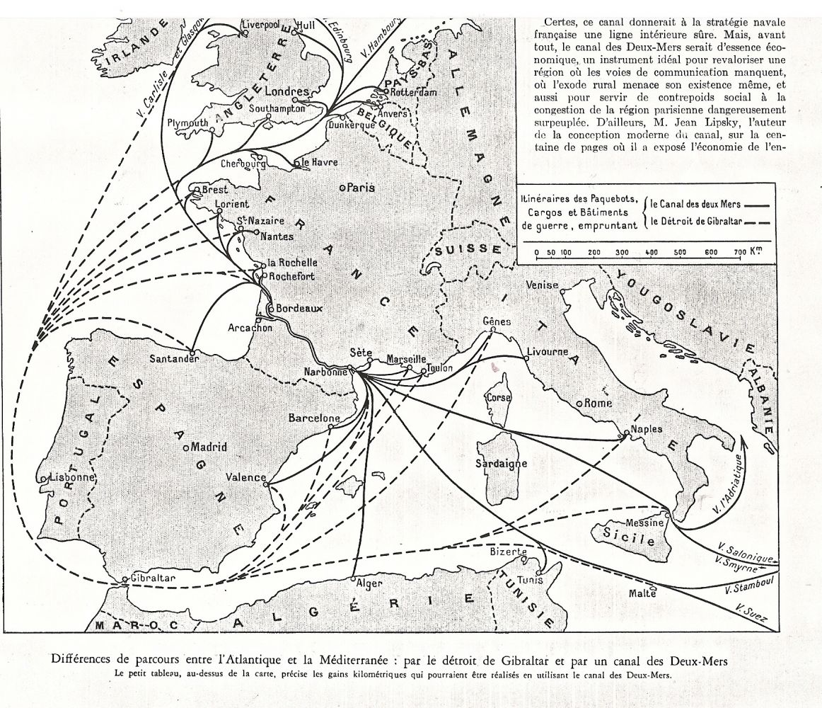 En résumé, il est raisonnablement permis de penser que la construction du canal des Deux-Mers accroîtrait très sensiblement la puissance navale française et assurerait l'indépendance de notre flotte de guerre ; et cette éventualité prend d'autant plus d'intérêt devant les revendications italiennes sur la mer "intérieure" et les prétentions espagnoles, affirmées en septembre 1930 devant l'assemblée de la Société des Nations à Genève, à être traitées en puissances méditéranéennes. La parole d'Edouard Lockroy : "La Méditerranée est dangereuse", n'a pas encore cessé d'être vraie...