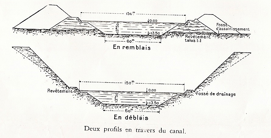 Le lit d'une voie navigable dont la section aurait 13 m 50 de profondeur, 60 mètres de largeur au plafond et 150 mètres environ au miroir serait ainsi façonné. Cette largeur au plan d'eau pourrait même atteindre 250 mètres sur certaines parties du parcours où le terrain le permettrait. Le rayon des courbes ne descendrait pas au-dessous du minimum de 2.500 mètres : ce serait le plus beau et le plus grand canal du monde.