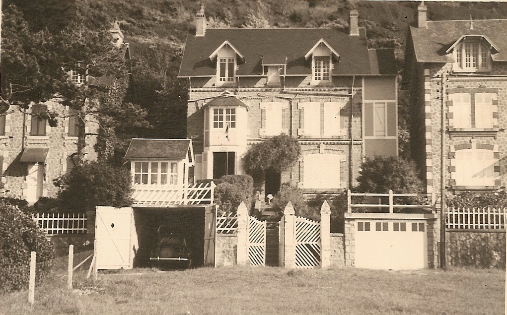 Cet été 1955 sera le dernier où l'on empilera les bagages sur le toit pour rentrer à Beaumont. Sur la jolie photo prise sur la terrasse de Ker-Mick-Hett, papa et maman n'imaginent pas encore les nouvelles perspectives de séjour à Carolles qui s'ouvriront à eux en habitant à Caen. Jean-François va commencer l'année de 7e comme pensionnaire à Paris, au lycée Fénelon : dès le mois de janvier il avait fallu s'inquiéter de son inscription. Ce sera dur, et nos parents réaliseront que tous, les uns après les autres, nous devrons suivre notre scolarité loin d'eux. Effectivement, dès les premiers jours de la scolarité de leur petit garçon, ils recherchent comment envisager autrement la vie professionnelle et familiale. Le projet va murir rapidement, et tout va s'organiser entre cette fin d'année 1955 et janvier 1956, quand a lieu le déménagement. Si Caen nous rapproche de Carolles, c'est l'inverse qui se produit pour Neuvy, et l'on ne pourra plus descendre à la gare chercher papa en chantant, avec des lampions! Ils devra venir en voiture, un trajet plus long, moins fréquent. Mais quel bonheur quand la voiture apparaissait, au détour du "rond-point" à la fin d'une journée d'attente !
