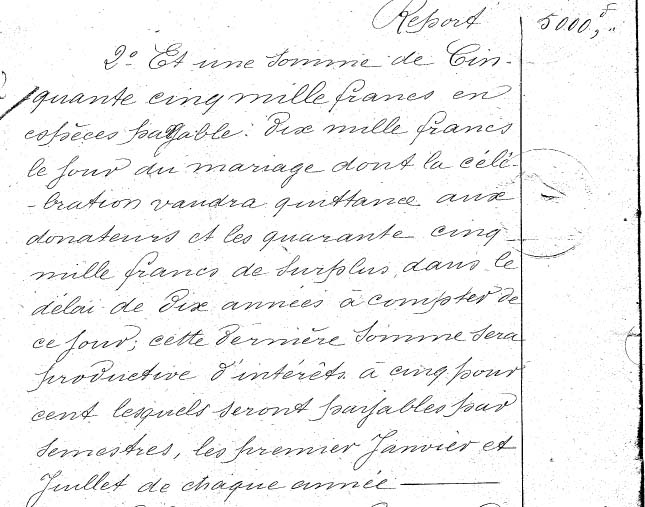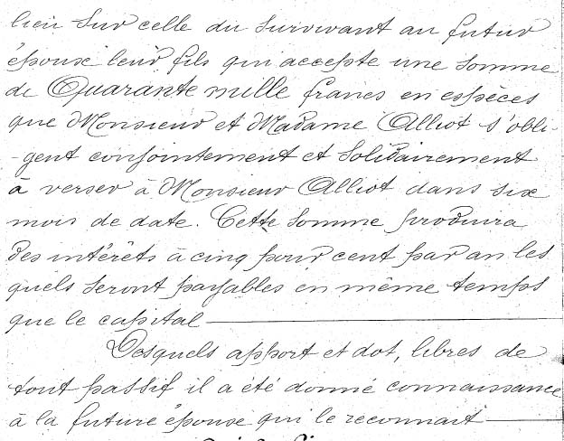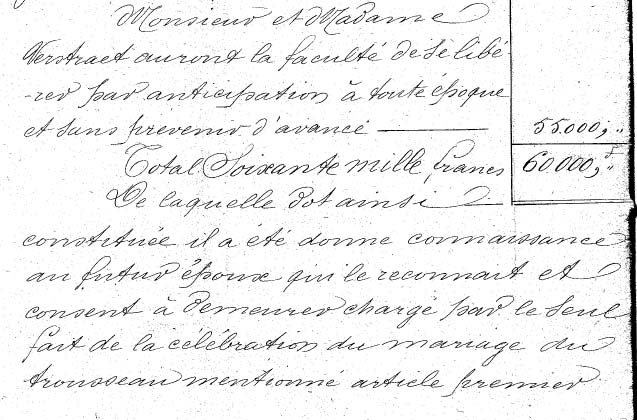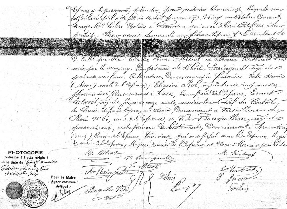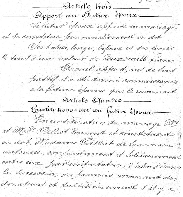 Contrat de mariageContrat de mariage est dressé chez Maître Leclerc, à Charenton-le-Pont (Seine) . Quelques extraits de ce contrat (voir extraits p1, p2, p3, p4, p5) illustrent ce que peuvent être les « apports en dots » dans ce milieu d’industriels à la fin du 19e siècle. On note aussi que la mère de chacun des mariés est "autorisée" par son mari à consentir à la dot…!