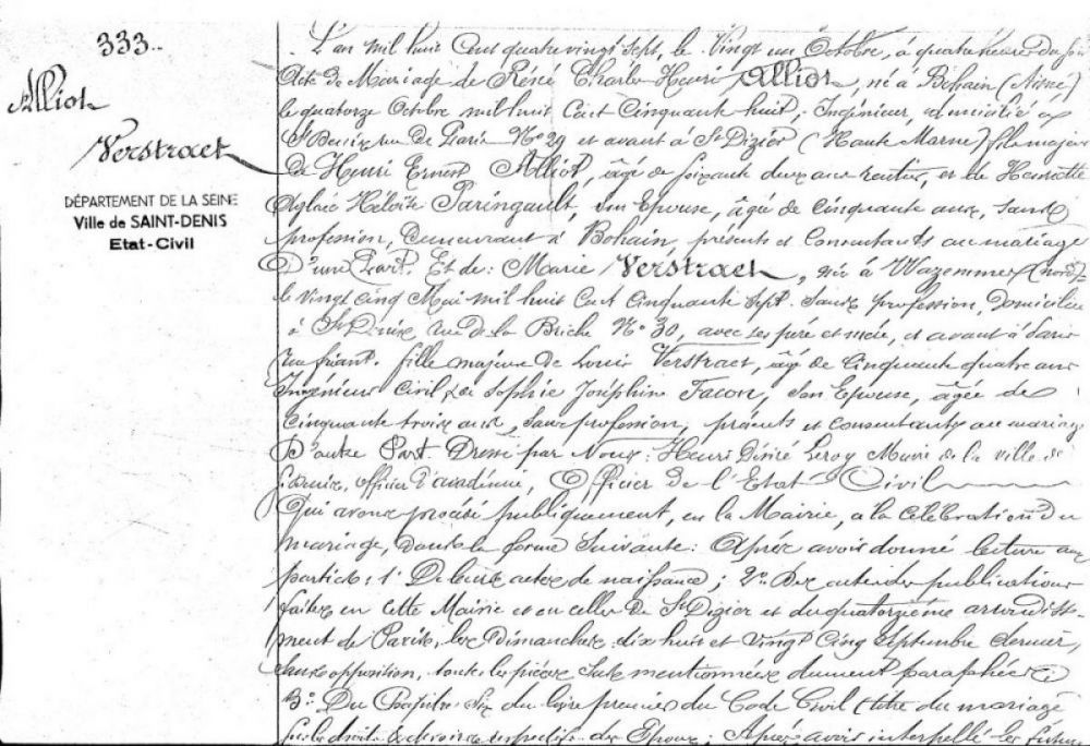 Rue de Paris à saint-DenisMais revenons en arrière, quand René est encore à Saint-Denis et s'y éprend de Marie Verstraet. Elle est la fille de Louis et de Sophie VERSTRAET (née Sophie FACON) . Elle habite encore avec eux 30 rue de la Briche. En 1887, René et Marie se fiancent. La date du mariage est fixée au 21 octobre de la même année.