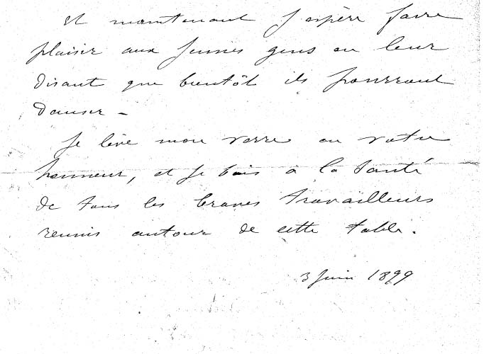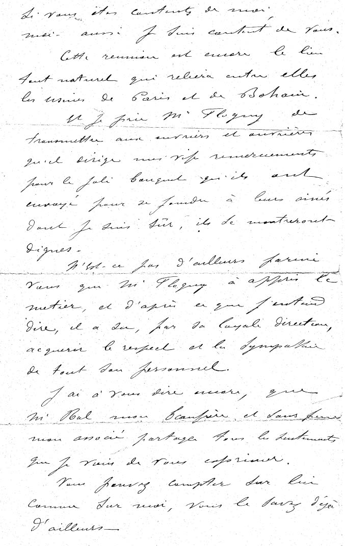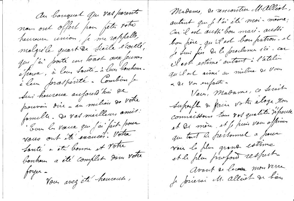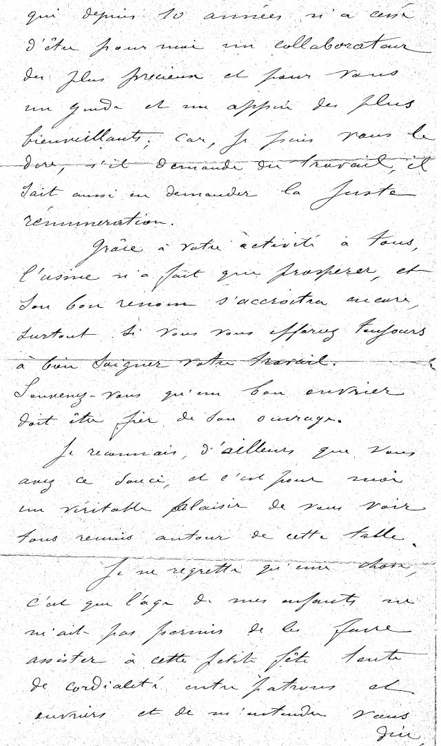 "(…… ) Ce bronze (… ) vous rappellera notre amitié, vous dira combien nous vous aimons, et plus tard, quand nous n’y serons plus, cette image fortifiera le cœur de vos enfants, leur montrera le bon chemin et, j’ose l’espérer, ils suivront votre exemple et verront que le cœur de l’ouvrier laborieux et honnête ne se donne pas à tout le monde mais à ceux là seulement qui le considèrent et l’apprécient.(……) Oui, dix années se sont déjà écoulées …. Que de choses j’aurais à rappeler depuis cette époque…. N’ai-je pas vu cette maison enfant, ne l’ai-je pas vue grandir, prospérer, n’ai-je pas vu tomber les murs pour les voir réédifier plus loin ? C’est à ce moment que j’ai commencé à admirer votre intelligence pour la façon avec laquelle vous saviez remettre tout à sa place (…)"