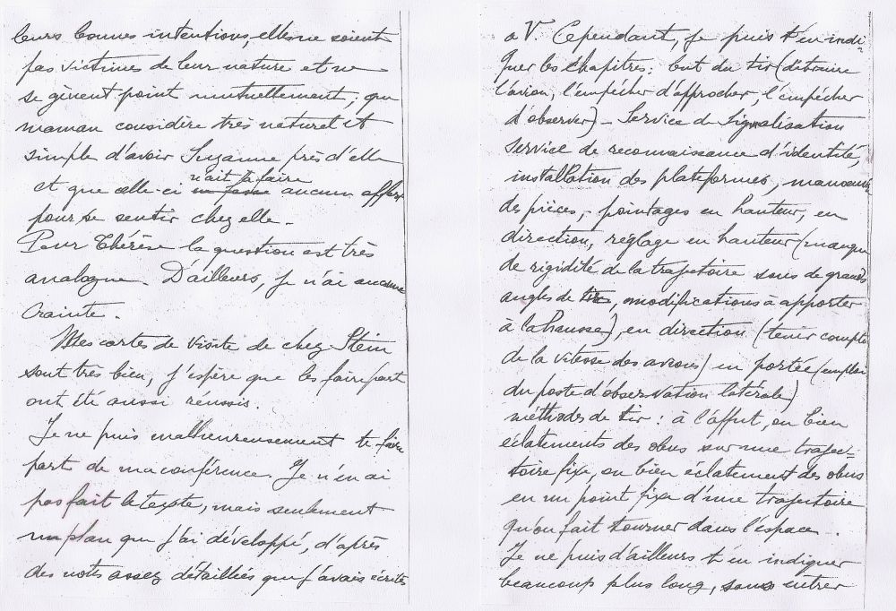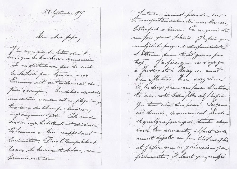 Le 8 septembre 1915, c'est à son père qu'écrit Maurice, en réponse à une lettre que celui-ci lui a écrite (fait rare... c'est d'habitude sa mère qui prend la plume). Il lui fait part de son ardent désir de voir ceux qui lui sont chers s’apprécier mutuellement, chacun avec son tempérament... Suzanne, sa toute jeune épouse, vient de passer quelques temps avec Marie et Thérèse. Maurice se rend bien compte que pour elle ce n'est pas facile, et il sait que son père peut le comprendre à demi mot. Mais Maurice s'adresse aussi dans ce courrier à celui qui, comme lui, connaît les techniques des tirs d'artillerie.... : Non que le régiment ait à effectuer alors des tirs. Mais Maurice est chargé de former les hommes pour la suite des opérations, et le but de la conférence qu'il prépare est la maîtrise des tirs d'obus vers les avions, afin d'empêcher les vols d'observation ennemis sur les lignes de front. Maurice parle aussi de l'offensive allemande sur le front russe... La fin de ce courrier, plus difficile à déchiffrer, est reprise ci-dessous: