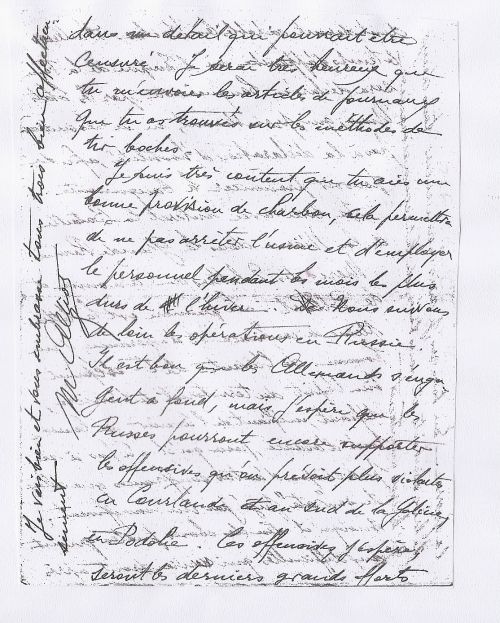 "Je suis très content que tu aies une bonne provision de charbon, cela permettra de ne pas arrêter l'usine et d'employer les personnels pendant les mois les plus durs de l'hiver.Nous suivons de loin les opérations en Russie. Il est bon que les allemands s'engagent à fond, mais j'espère que les russes pourront encore supporter les offensives qu'on prévoit plus violentes en Courlande et au sud de la Galicie, en Podolie. Ces offensives, j'espère, seront les derniers grands efforts".... (il doit manquer la fin de la phrase)