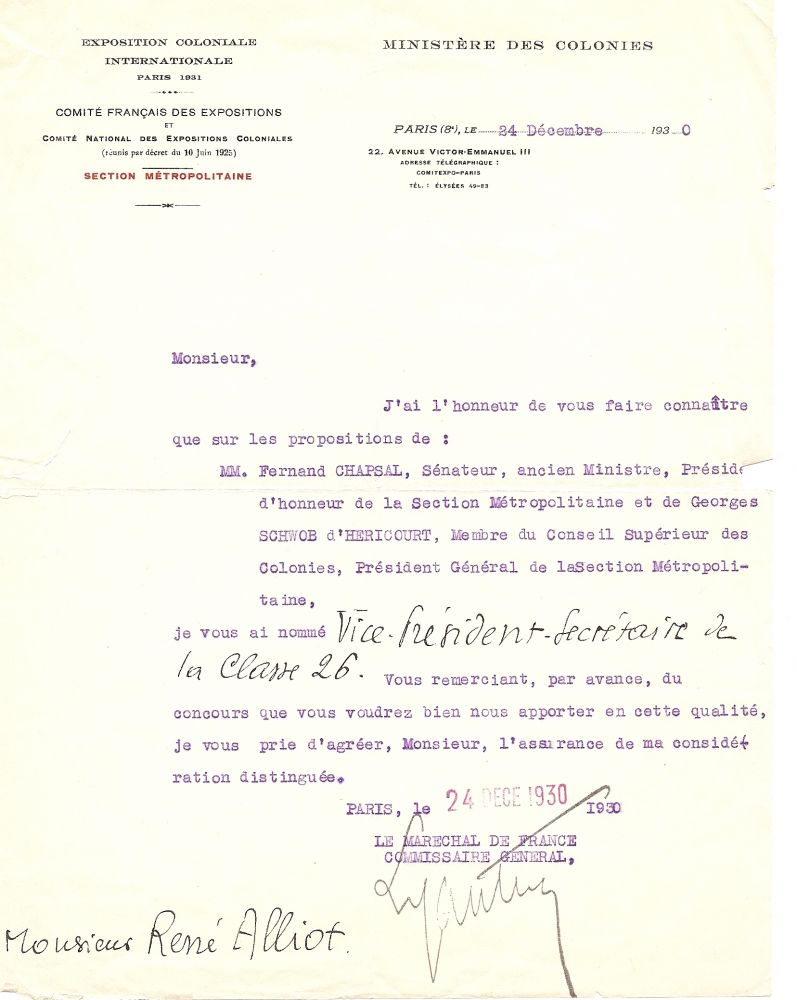 Exposition colonialeLe 24 décembre 1930, René reçoit du Maréchal de France Lyautey, alors Commissaire Général du Comité français des expositions prévues pour l’exposition coloniale internationale de 1931 à Paris, une nomination  de « Vice-président secrétaire de la Classe 26, groupe V, de la section Métropolitaine de l’Exposition Coloniale ». Elle doit se tenir à Vincennes et, comme les précédentes, elle célèbrera les vertus du commerce colonial.