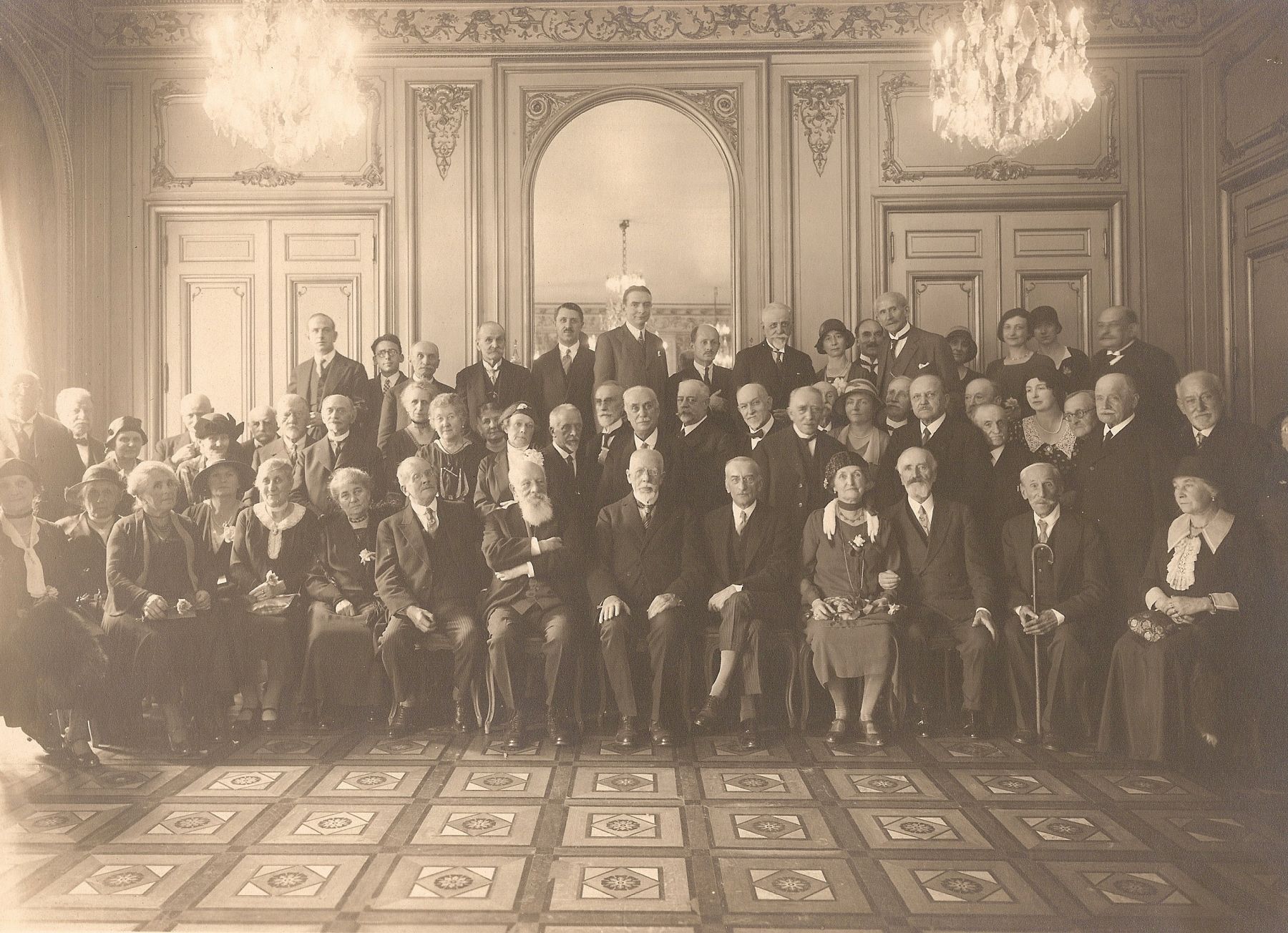 1931 : C’est encore le cinquantième anniversaire de la promotion 1881 de l’Ecole Centrale de Paris. René a été élu par ses pairs délégué de cette promotion. On le reconnaît au 2ème rang, derrière la femme assise, 4ème en partant de la droite. De Marie, modeste, on aperçoit vaguement le visage derrière une femme dont le chemisier blanc semble se prolonger par la barbe blanche du premier rang. Thérèse et René sont au fond, entre la glace et la porte de droite. Suzanne, sur le même rang qu’eux, au fond, 3ème à partir de la droite de la photo.