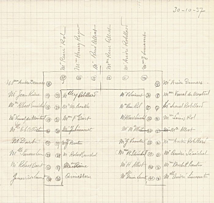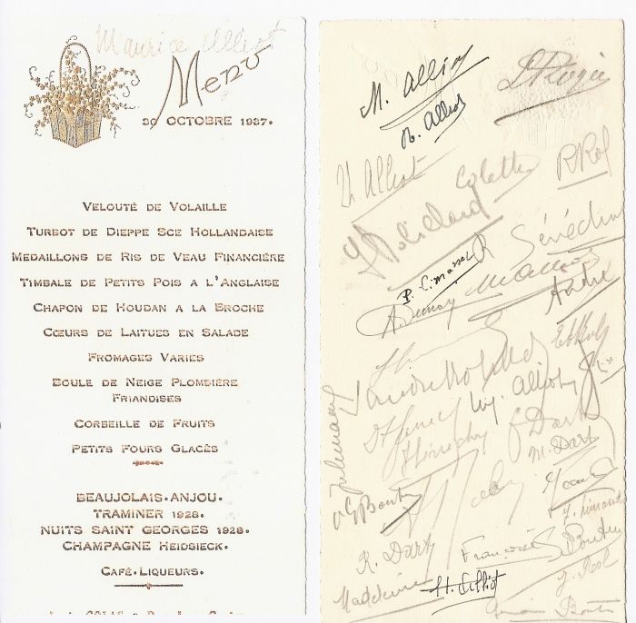 Plan de table et menu, conservés par Maurice, redonnent vie et saveur à ces moments. En agrandissant le menu, on en verra aussi le verso, signé par les convives!