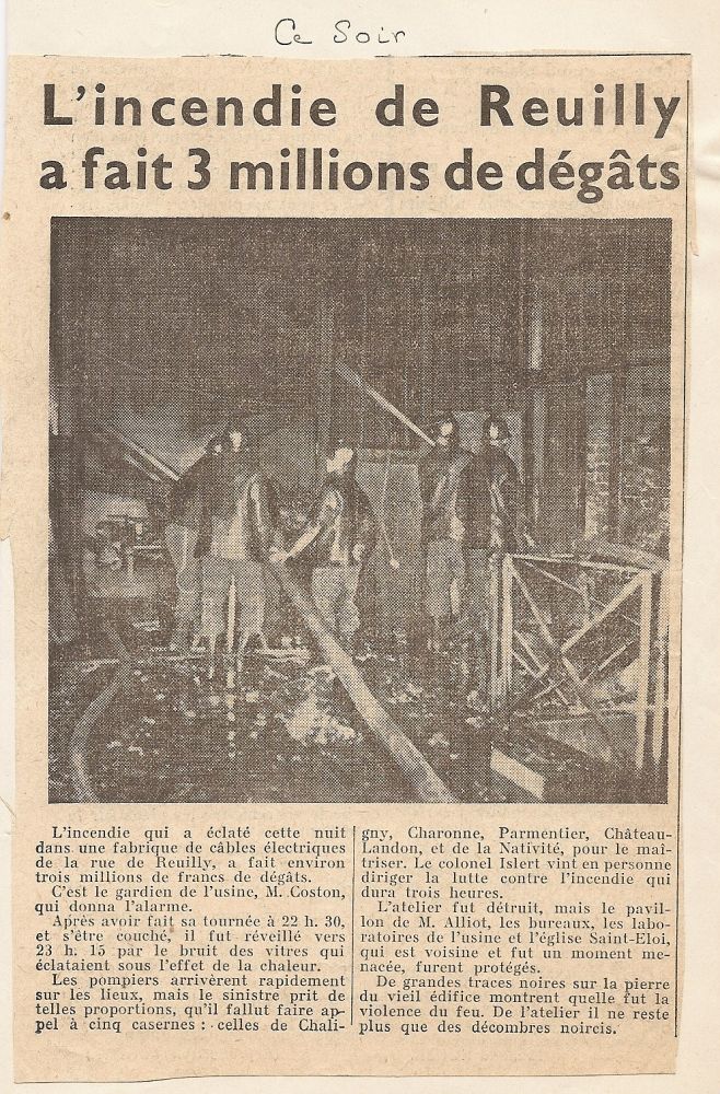 Et puis, brutalement, dans la nuit du 28 septembre 1937, un gigantesque incendie scelle la fin des activités industrielles de l’usine de Reuilly. De ces ateliers et des autres, il ne va rester que des ruines calcinées. Seuls les bureaux et les maisons d'habitation sont épargnés. L'événement est décrit dans la presse des jours suivants. On a eu très peur pour les abords de l'usine.