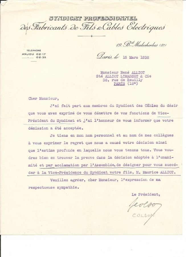 En 1938, (il a 80 ans!) il donne sa démission de vice-président du Syndicat des Fabricants de Fils et Câbles Electriques à M. Cosson, son président, qui lui exprime le regret que lui cause cette décision et l’estime profonde dans laquelle tous le tiennent, estime dont René trouve la preuve dans la « décision adoptée à l’unanimité et par acclamation par l’Assemblée, de désigner pour vous succéder à la Vice-Présidence du Syndicat votre fils, M. Maurice Alliot. » (lettre du Président Colson à René, 15/03/1938).